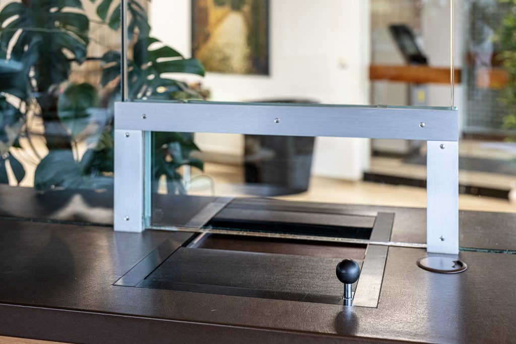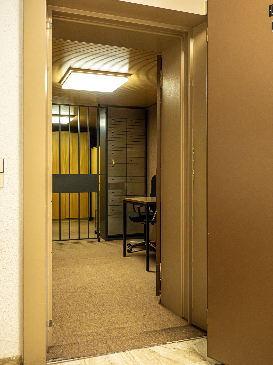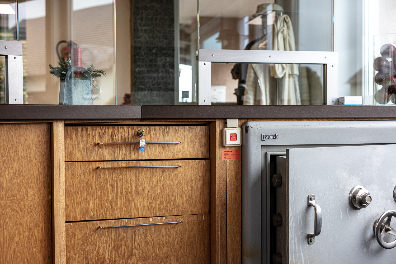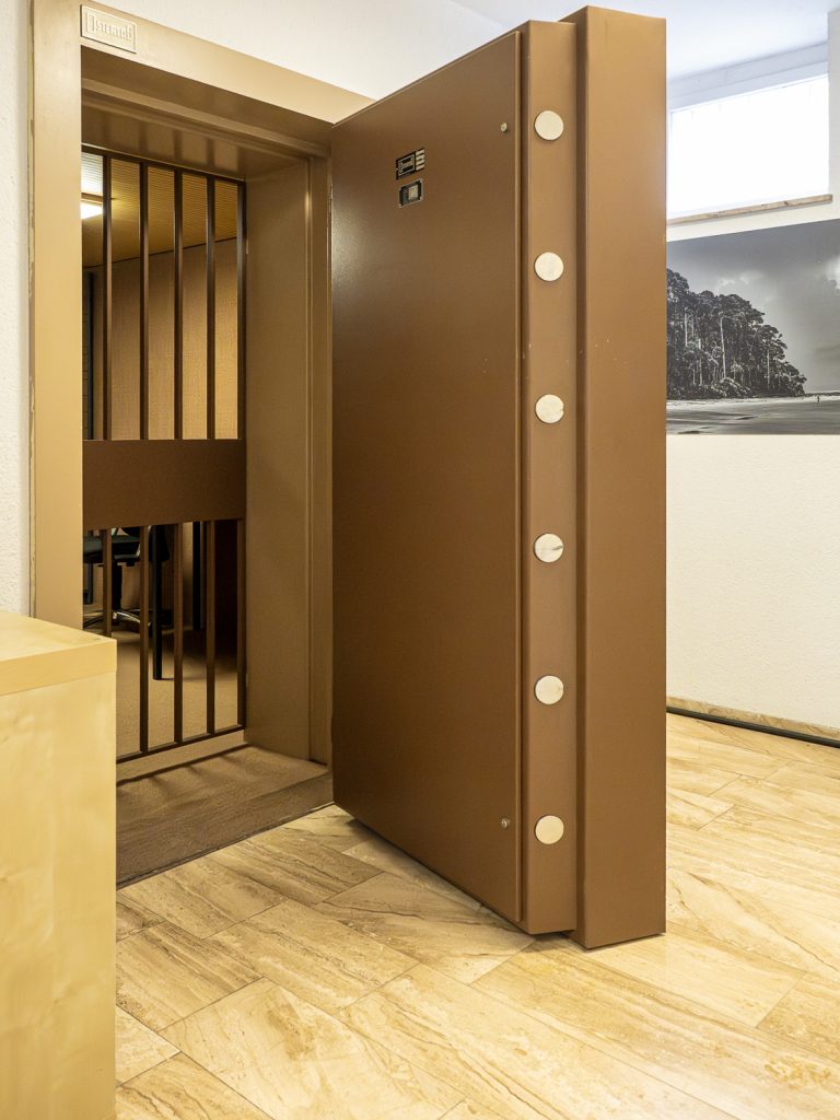 Das ehemalige Bankgebäude bietet zahlreiche originale Details aus seiner früheren Nutzung – darunter der historische Kassenschalterraum mit Durchreichen, Schließfächer sowie ein vollständig erhaltener Tresorraum.